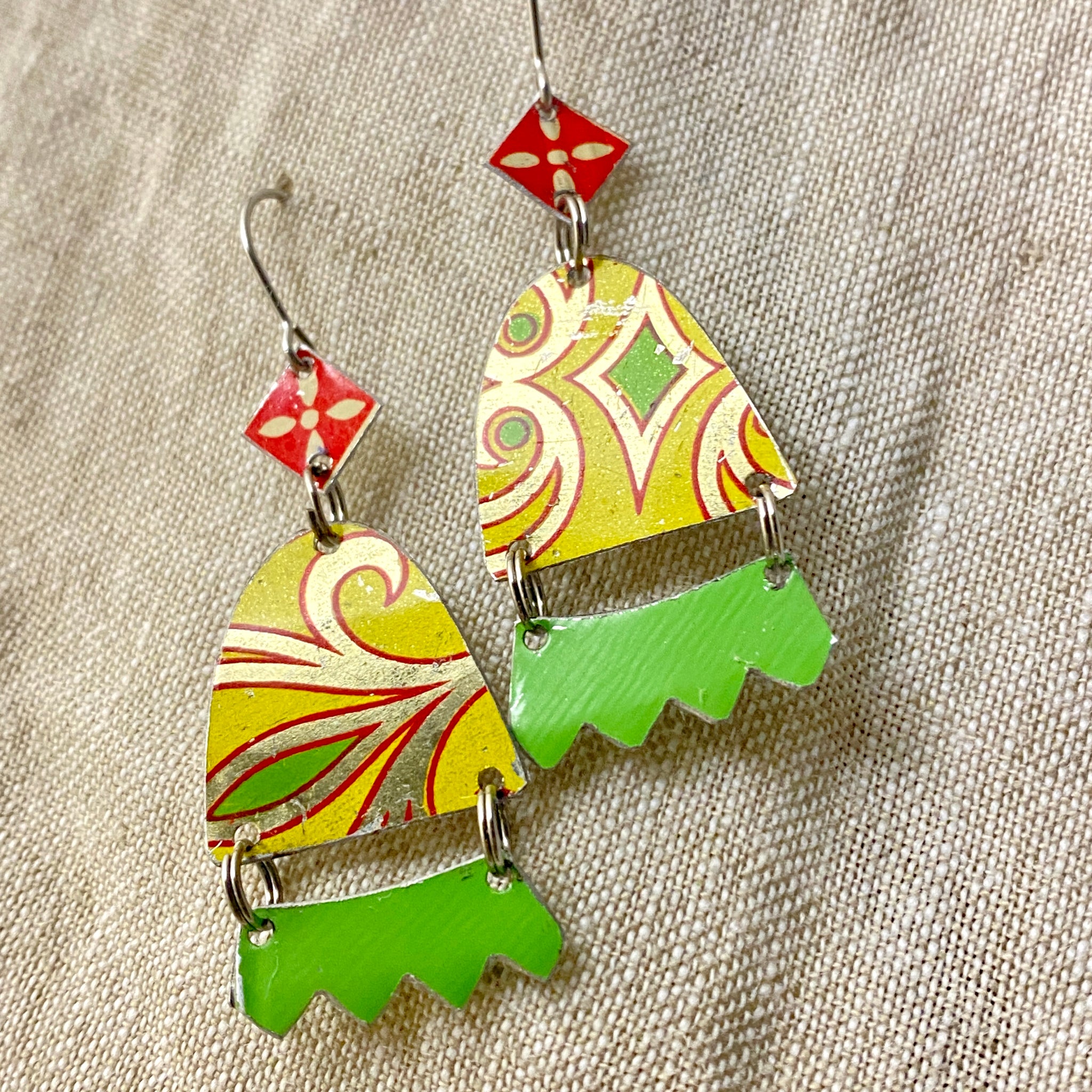 Each piece is hand cut, edges filed and finished smooth and then connected with surgical stainless steel split rings.  A surgical stainless steel ear wire finishes the look.