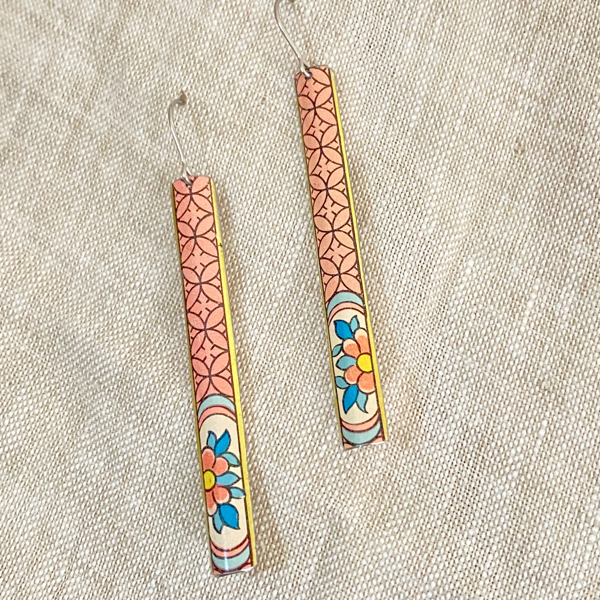 Each piece is hand cut, edges filed and finished smooth and then slightly formed. A surgical stainless steel ear wire finishes the look.