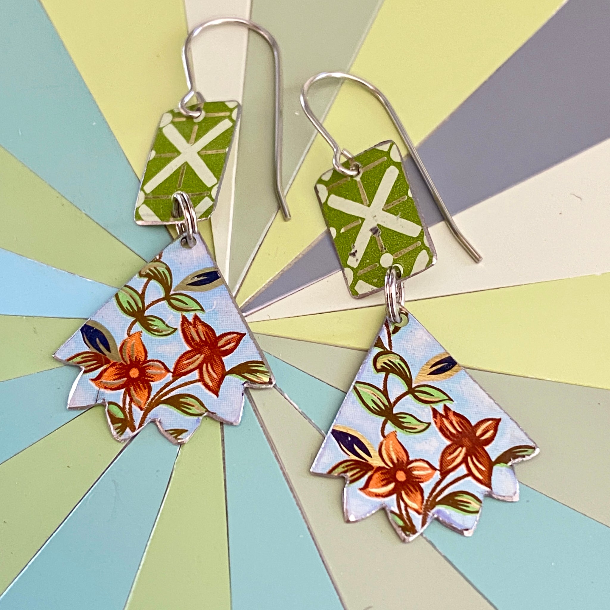 Each piece is hand cut, edges filed and finished smooth and then connected with surgical stainless steel split rings.  A surgical stainless steel ear wire finishes the look.