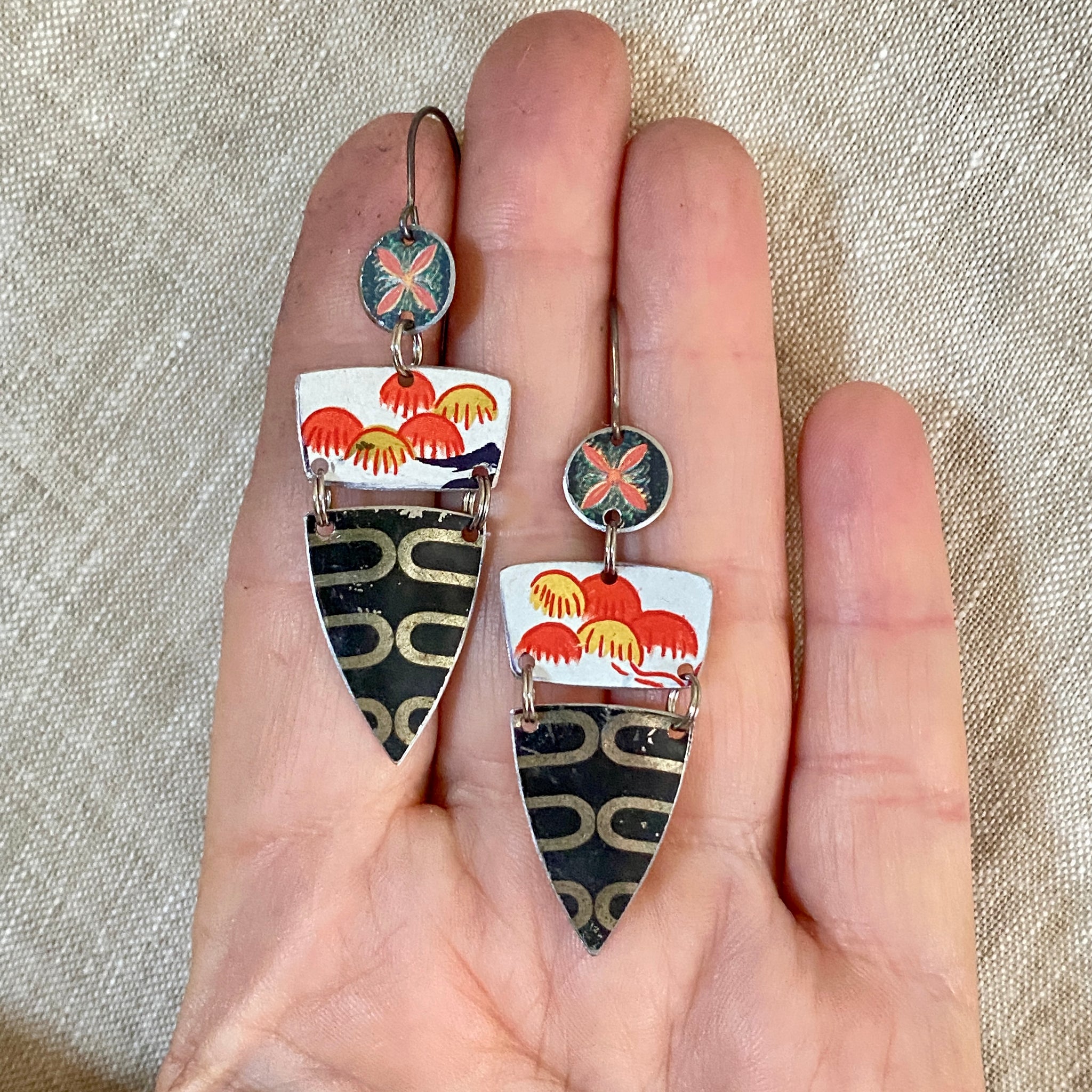 Each piece is hand cut, edges filed and finished smooth and then connected with surgical stainless steel split rings.  A surgical stainless steel ear wire finishes the look.