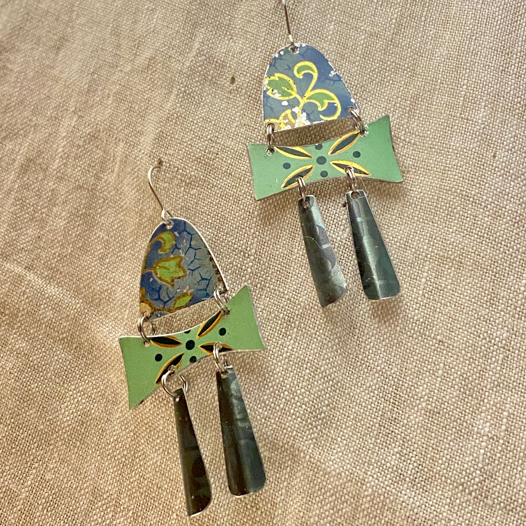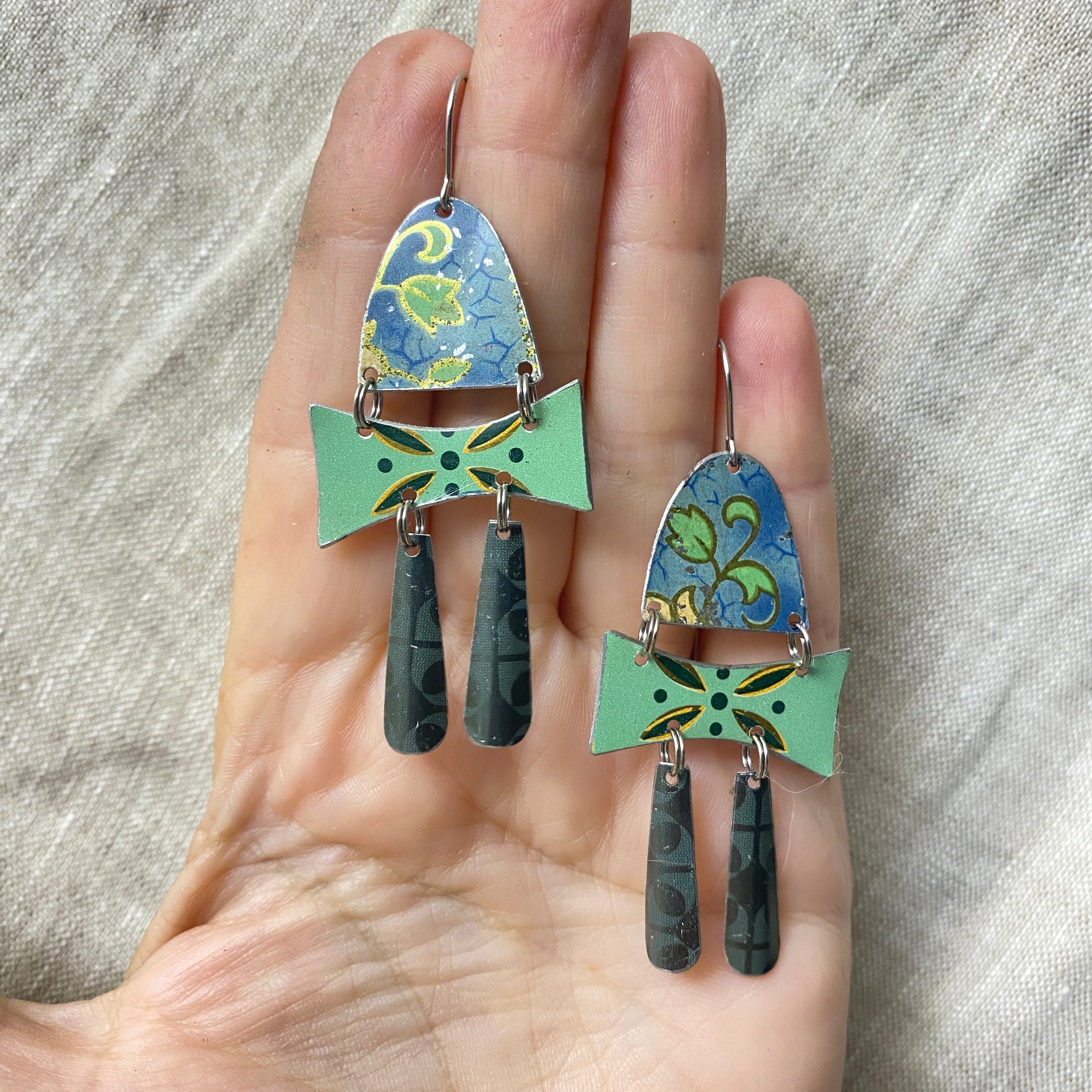 Each piece is hand cut, edges filed and finished smooth and then connected with surgical stainless steel split rings.  A surgical stainless steel ear wire finishes the look.