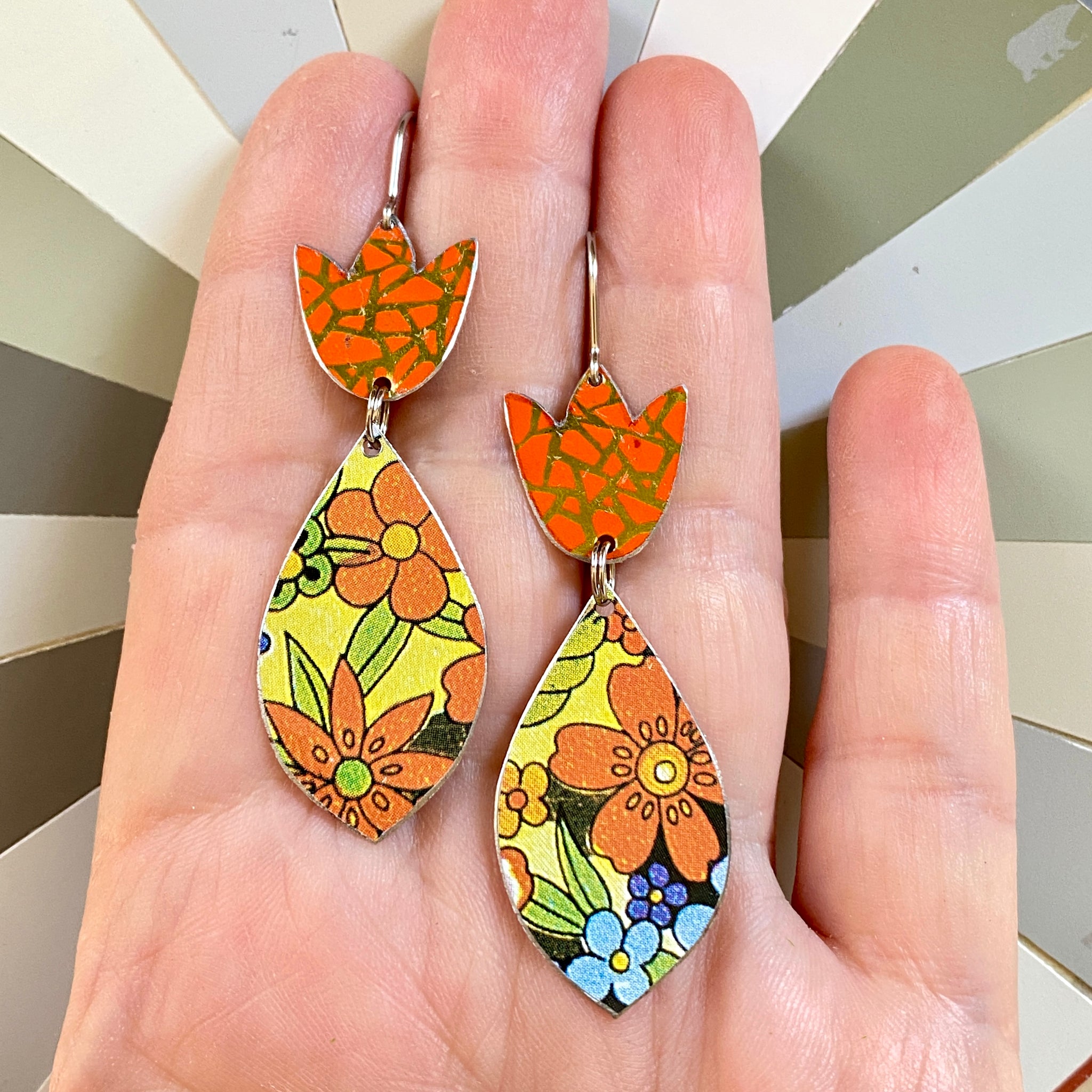 Each piece is hand cut, edges filed and finished smooth and then connected with surgical stainless steel split rings. A surgical stainless steel ear wire finishes the look.