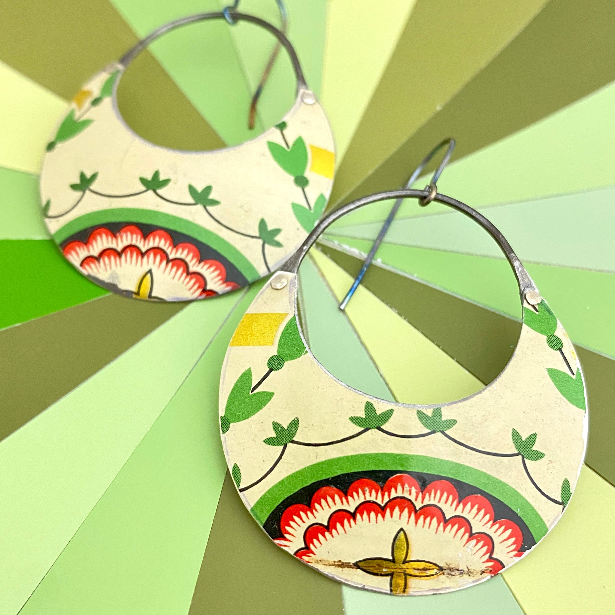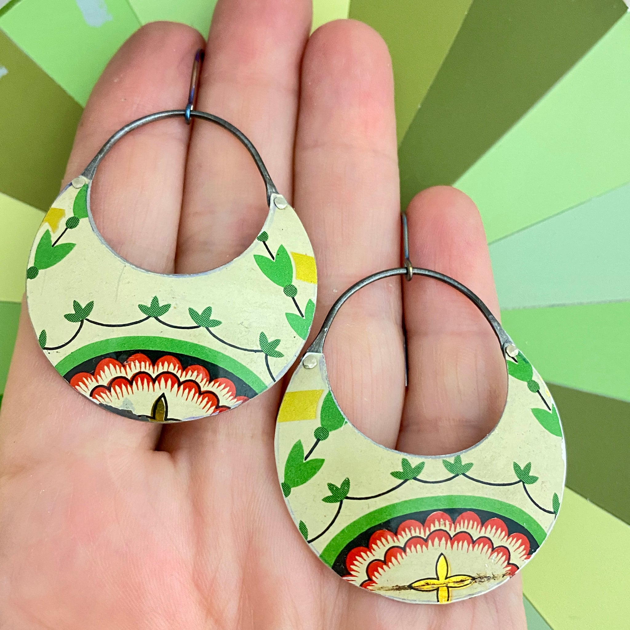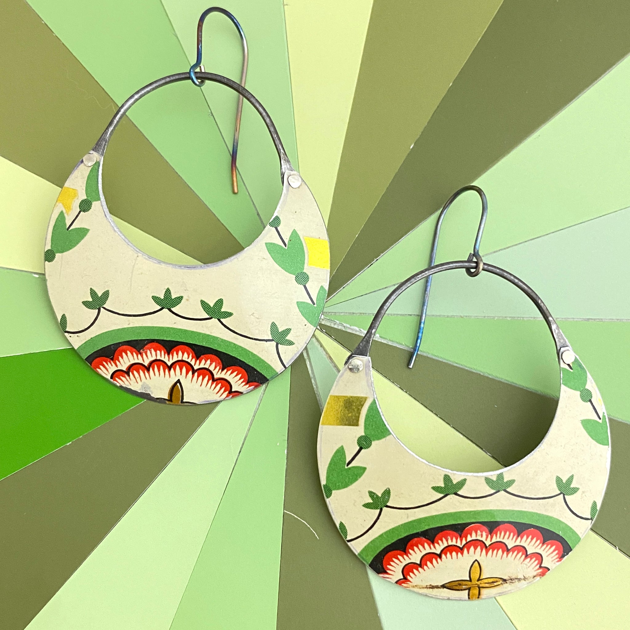 Each piece is hand cut, edges filed and finished smooth and riveted to a length of waxed steel wire. A surgical stainless steel ear wire finishes the look.
