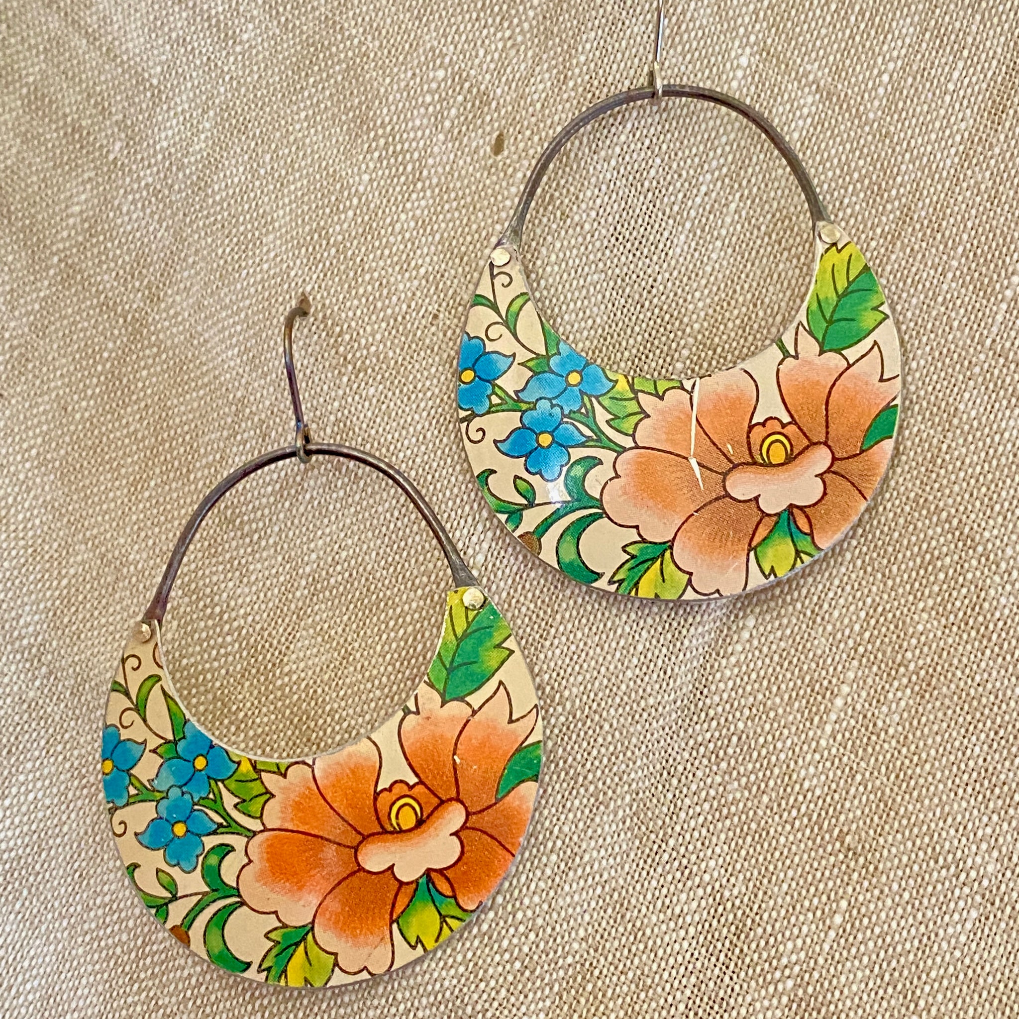 Each piece is hand cut, edges filed and finished smooth and riveted to a length of waxed steel wire. A surgical stainless steel ear wire finishes the look.