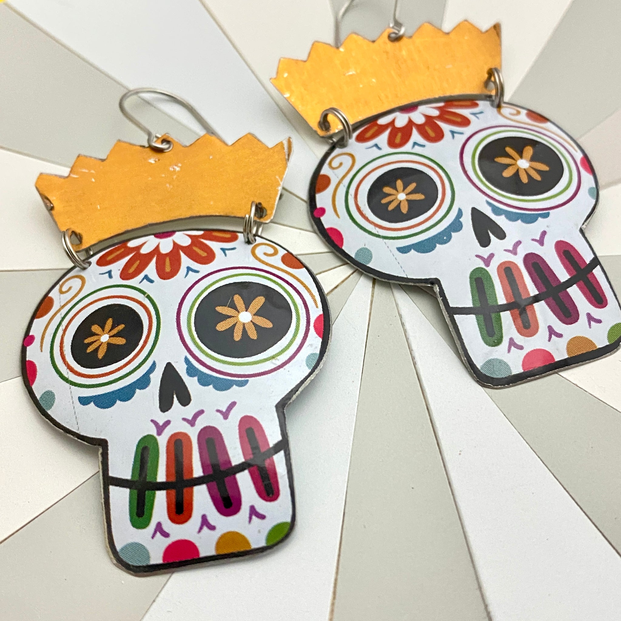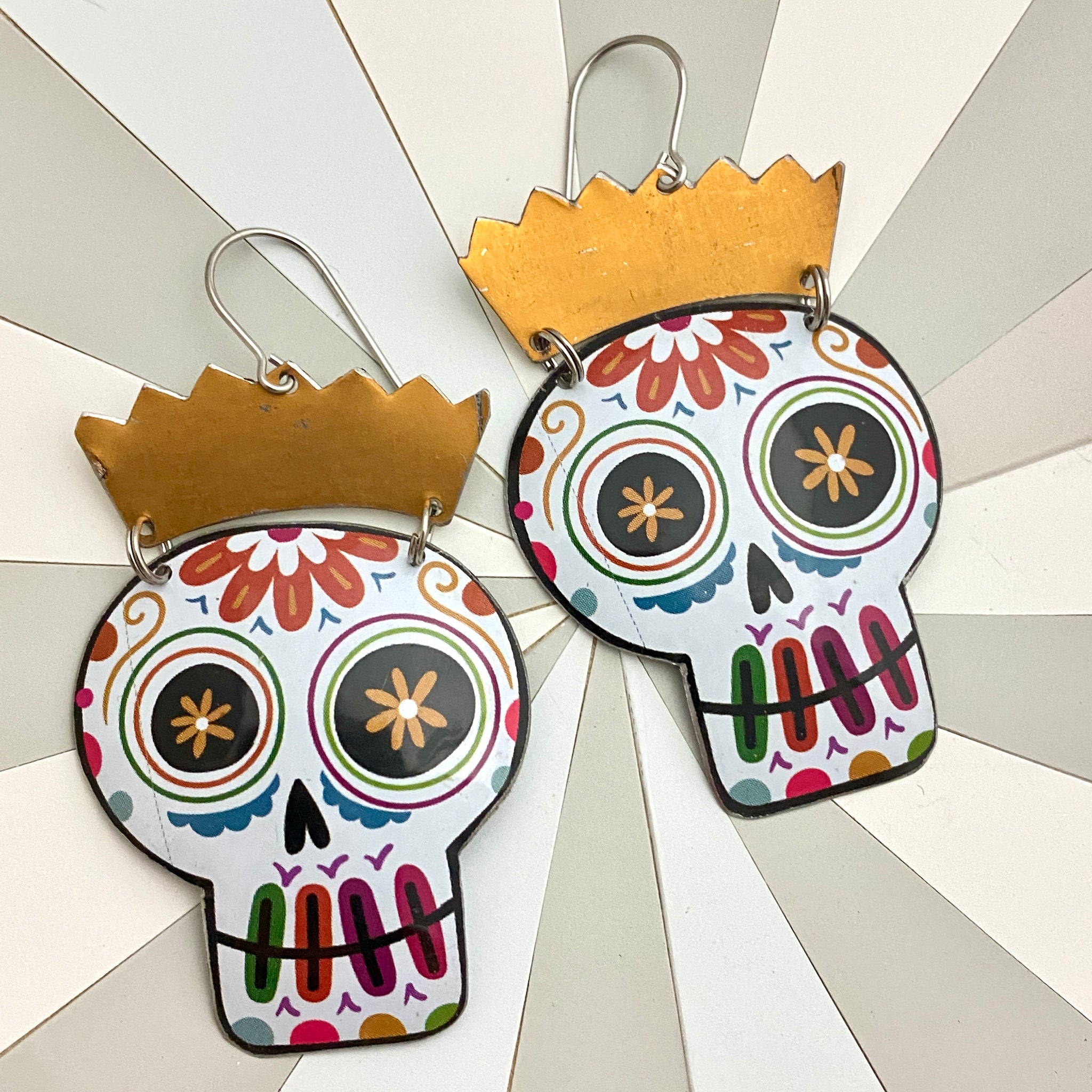 Square Jawed & Gold Sugar Skulls Tin Earrings