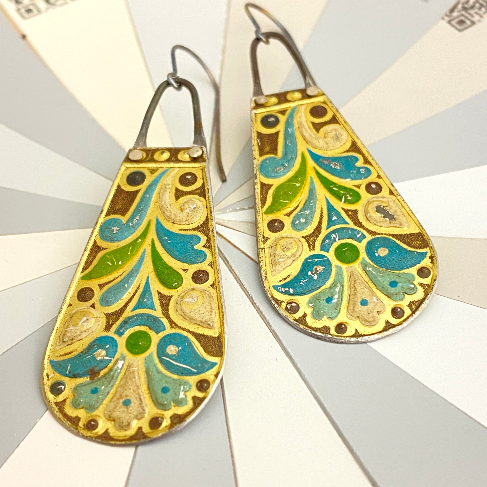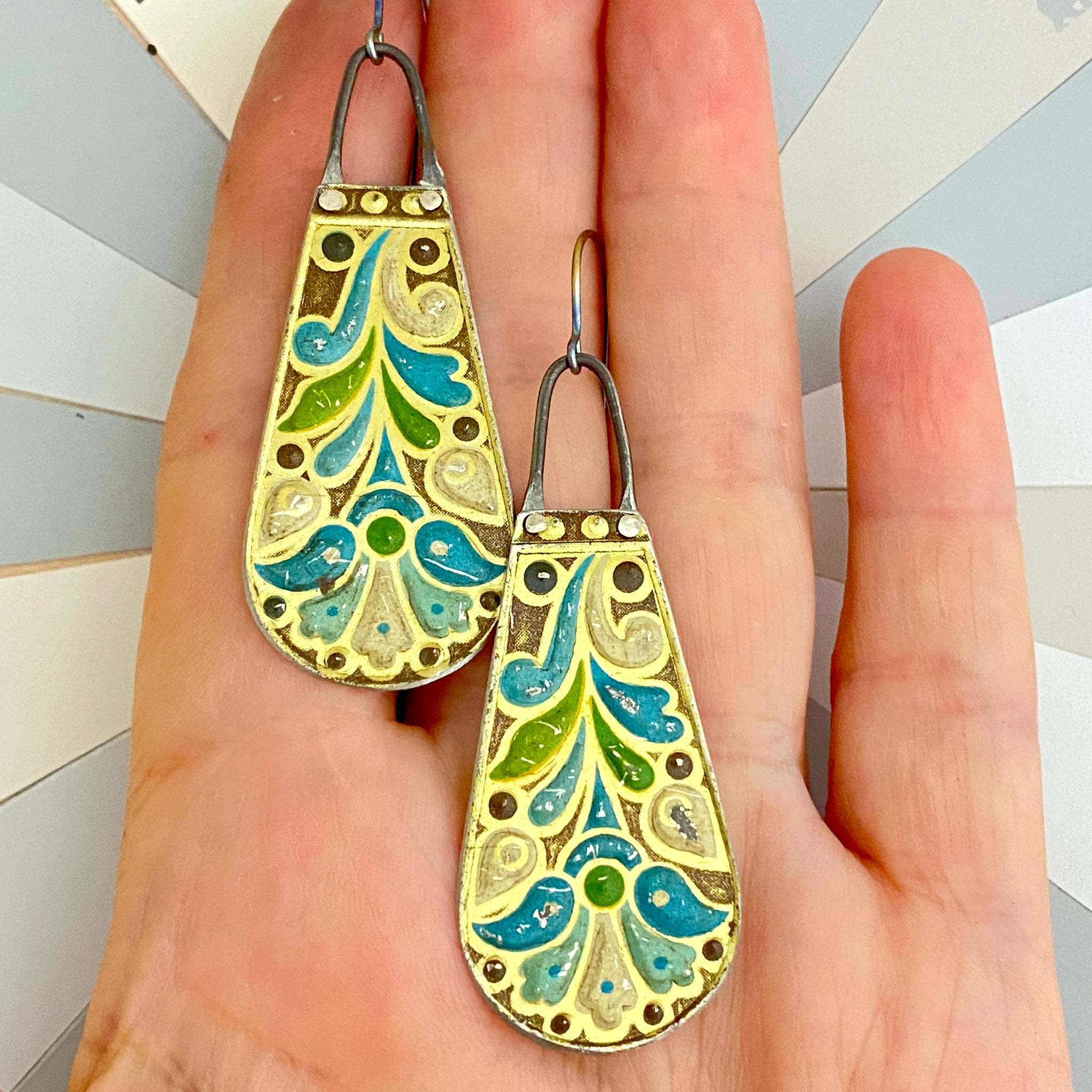 Each piece is hand cut, edges filed and finished smooth and riveted to a length of waxed steel wire. A surgical stainless steel ear wire finishes the look.